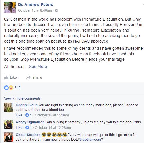My Banana for as long as I can remember has never been up for more than 3mins. This problem almost ruined my happy home before I discovered my permanent solution through a friend of my wife. I don’t want to say much here than to go straight to the point because my sweetheart has already explained all what we passed through BUT NOWLadies outside there now envy my wife when she made a post on facebook to know if women love big p*nis and long lasting s.ex. after I started satisfying her on the bed thanks to these products